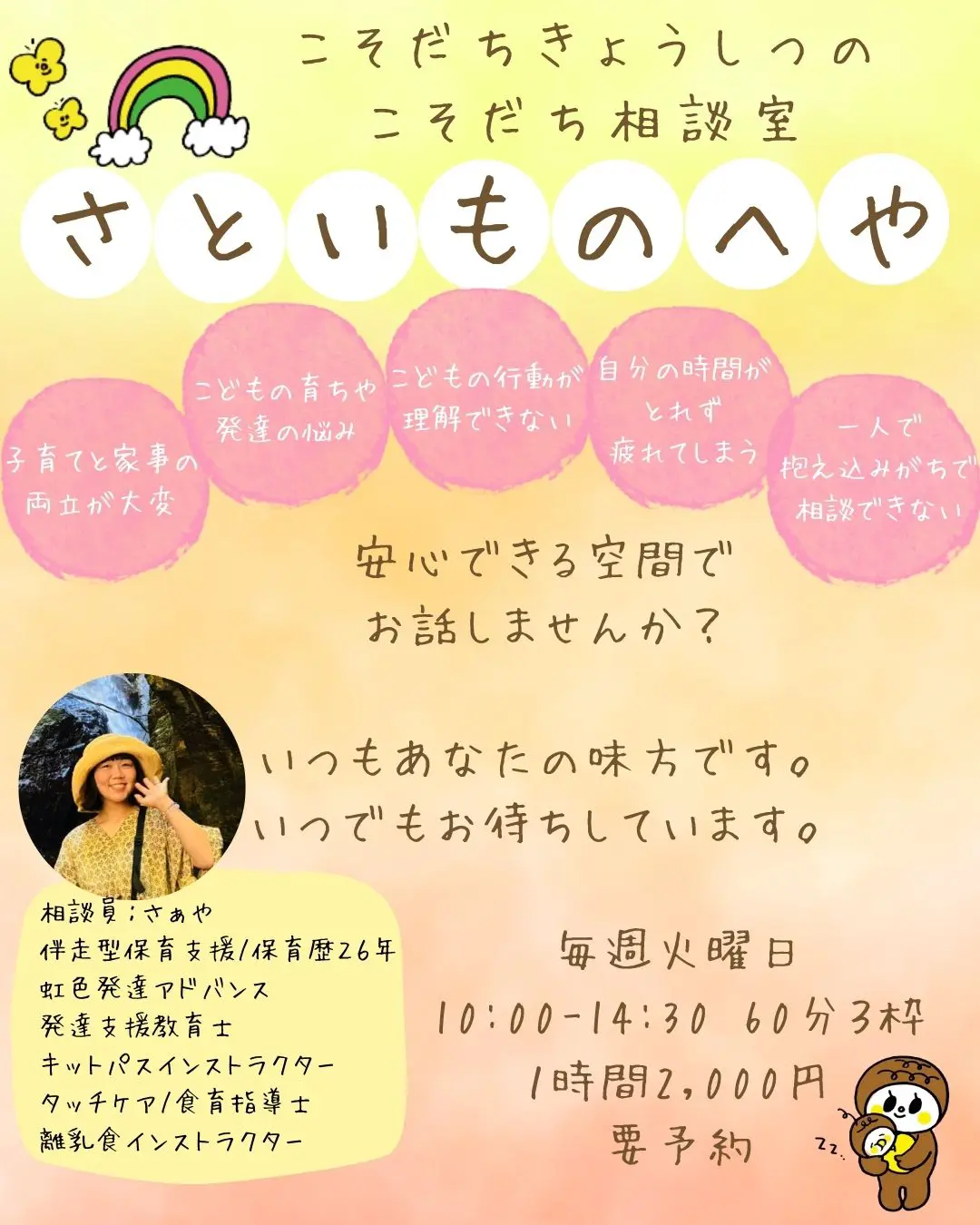 どなたでも気軽にご相談いただける、こそだち相談室さといもの部屋(毎月第1火曜日はお休みです。)